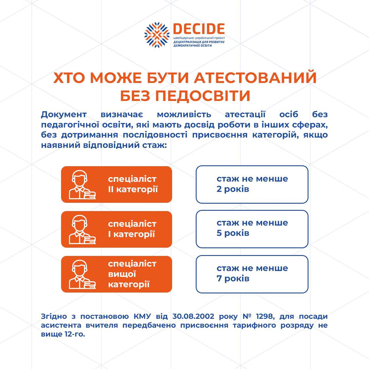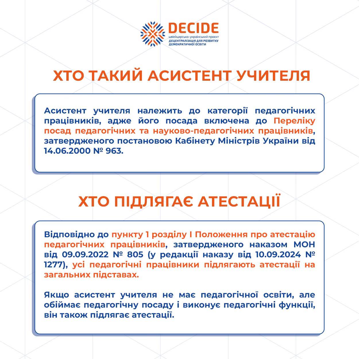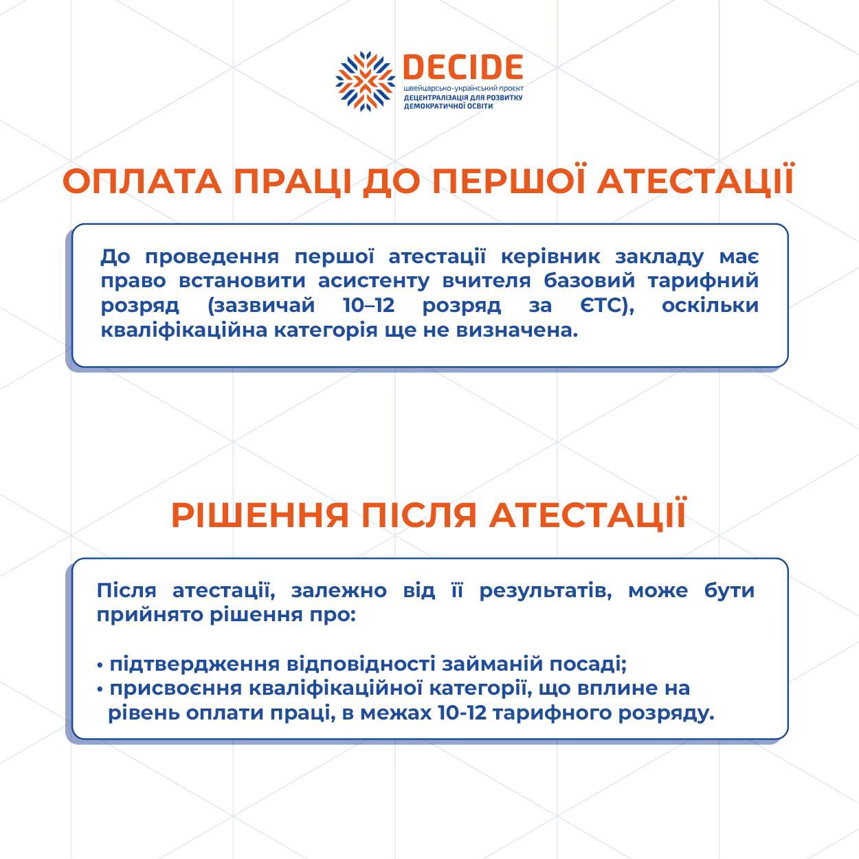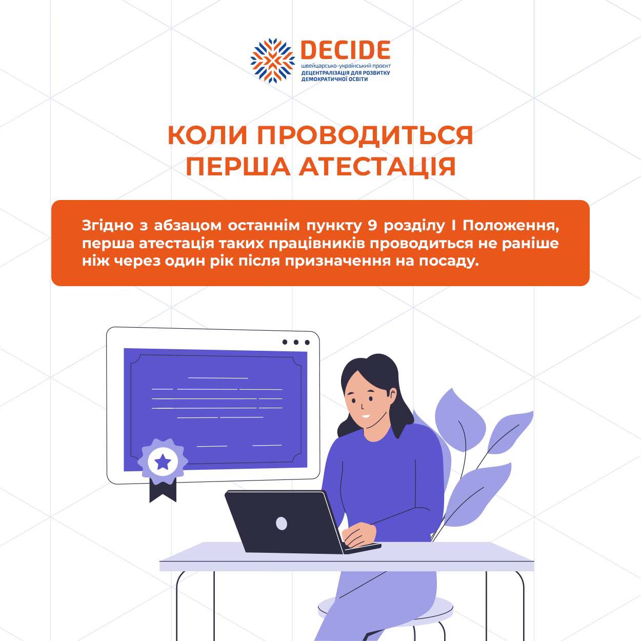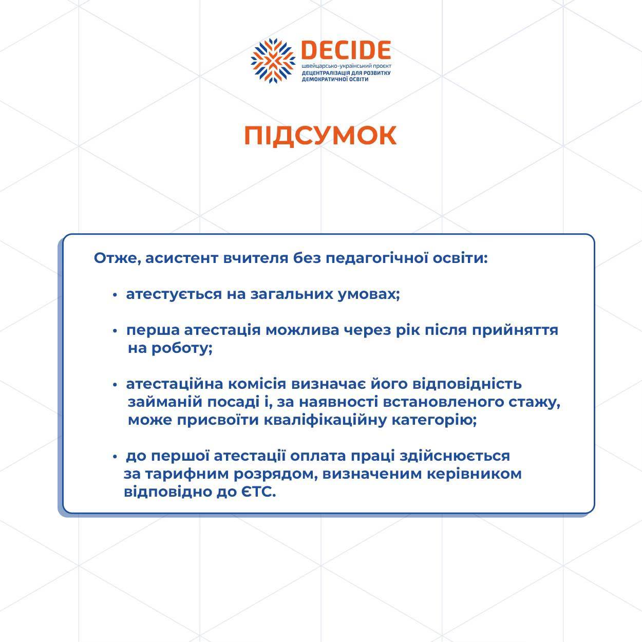 🔹Тема атестації викликає чимало запитань у керівників закладів освіти та самих педагогів. Тому проєкт DECIDE підготував інфографіку, яка пояснює, коли та як атестується асистент учителя, якщо він не має педагогічної освіти.