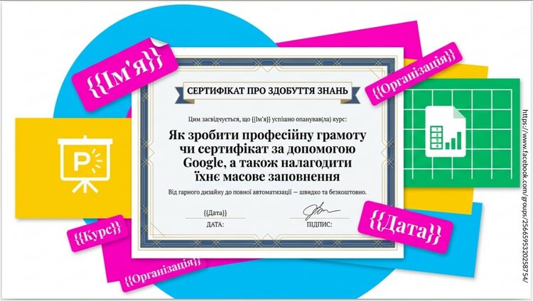 якщо стандартний дизайн у Slides здається занадто простим, створіть сертифікат у Canva, збережіть як картинку, встановіть її фоном у Google Slides, а поверх розмістіть теги .