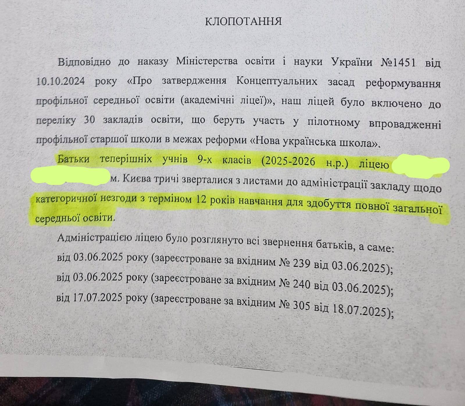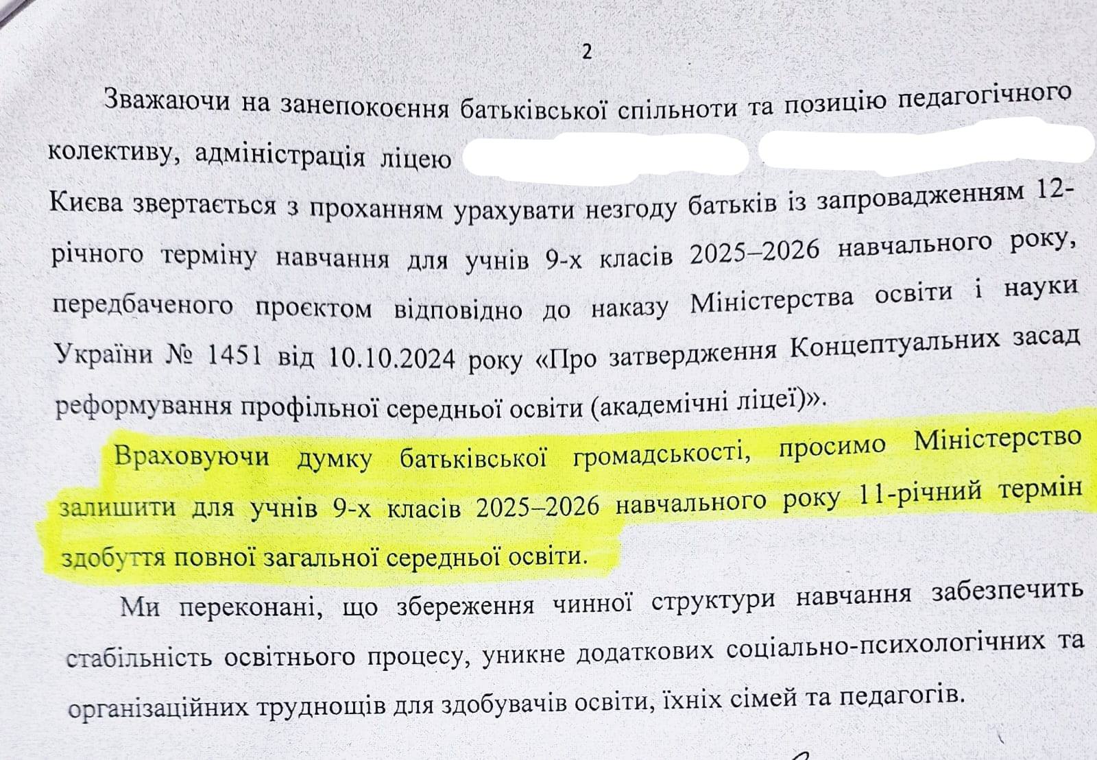 Майбутні випускники 9-х класів мали б із наступного 2026/2027 навчального року стати тими, хто навчатиметься три роки (10, 11 та 12 класи). Так вирішило МОН та школа, а от батьки сказали: "Ні!" Бо вони переконані, що "збереження чинної структури навчання забезпечить стабільність освітнього процесу, дозволить уникнути додаткових соціально-психологічних та організаційних труднощів для здобувачів освіти, їхніх сімей та педагогів". Директор школи на багаторазові прохання батьків звернувся до реформаторів, до МОН. І як ви думаєте, що сталося далі? Можливо, міністр або його профільний заступник поїхали до школи? Зустрілися з громадою закладу, почали переконувати, роз'яснювати, у чому перевага 12-го класу?..