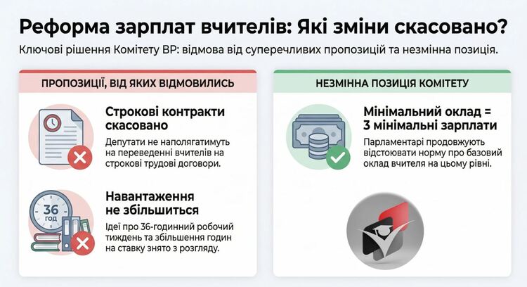 Народні депутати, які працюють у Комітеті Верховної Ради з питань освіти, науки та інновацій, суттєво переглянули свої підходи до реформування системи оплати праці педагогів та трудових відносин. Зокрема, голова комітету Сергій Бабак повідомив, що парламентарі більше не наполягатимуть на запровадженні строкових контрактів для вчителів, збільшенні тижневого навантаження та введенні 36-годинного робочого тижня для педагогів.