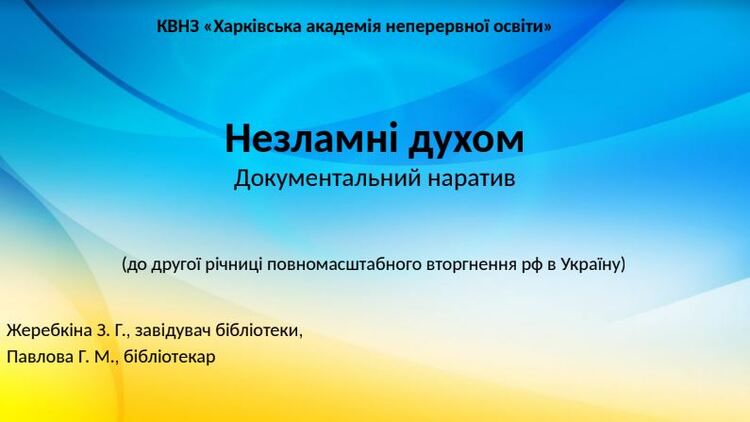 Матеріали документального наративу «Незламні духом» підготовлені до другої річниці повномасштабного вторгнення рф в Україну, можуть бути використані педагогічними та бібліотечними працівниками для організації годин спілкування, інших заходів національно-патріотичного спрямування.
