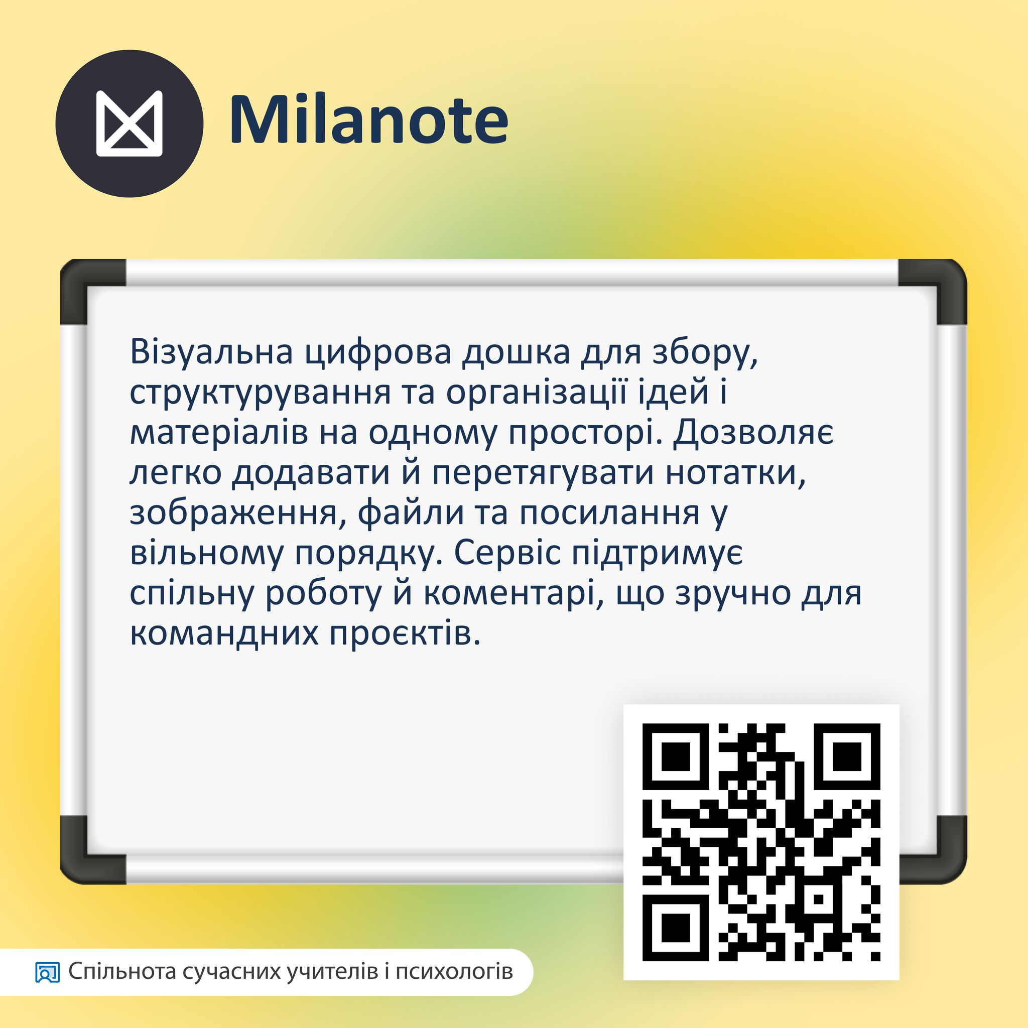 Вона чудово підходить для планування уроків, створення концепцій, проєктної та творчої роботи. У Milanote дуже зручно вибудовувати логіку: групувати матеріали, пов’язувати ідеї між собою та бачити загальну картину. Особливо сподобається вчителям гуманітарних дисциплін і учням, які люблять структуру та візуальність.