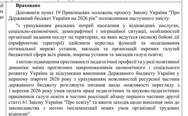 Сьогодні також вийшов пост народного депутата Ярослава Железняка, в якому він надав скан поправки до держбюджету та власний висновок, що обіцяного підвищення до трьох мінімальних зарплат педагогам середньої освіти не побачити з січня 2026 року: “До речі, ще про Уряд і Бюджет. А всі ж зрозуміли, що підвищення зарплат вчителям на 50% з січня не буде? Перегляд системи на “три мінімалки” теж. Отже депутати правку провели, але Уряд просто її відхилив….ну точніше написав, що “може колись у вересні”, але не факт….. А чому зрозуміли? Тому що гроші, які в тому числі мали йти на підвищення зарплат вчителям, підуть на Кешбек, “1000 Зеленського”, безкоштовне харчування для всіх, УЗ-3000 і інший популізм…. Тобто не тільки військовим в підвищенні зарплати відмовили, хоч мінімальної. А і нормально вчителям теж”.