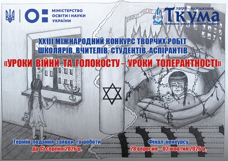 Міністерство освіти і науки України та Український інститут вивчення Голокосту «Ткума» оголошують ХХІІІ Міжнародний конкурс творчих робіт школярів, вчителів, студентів, аспірантів «Уроки війни та Голокосту – уроки толерантності»