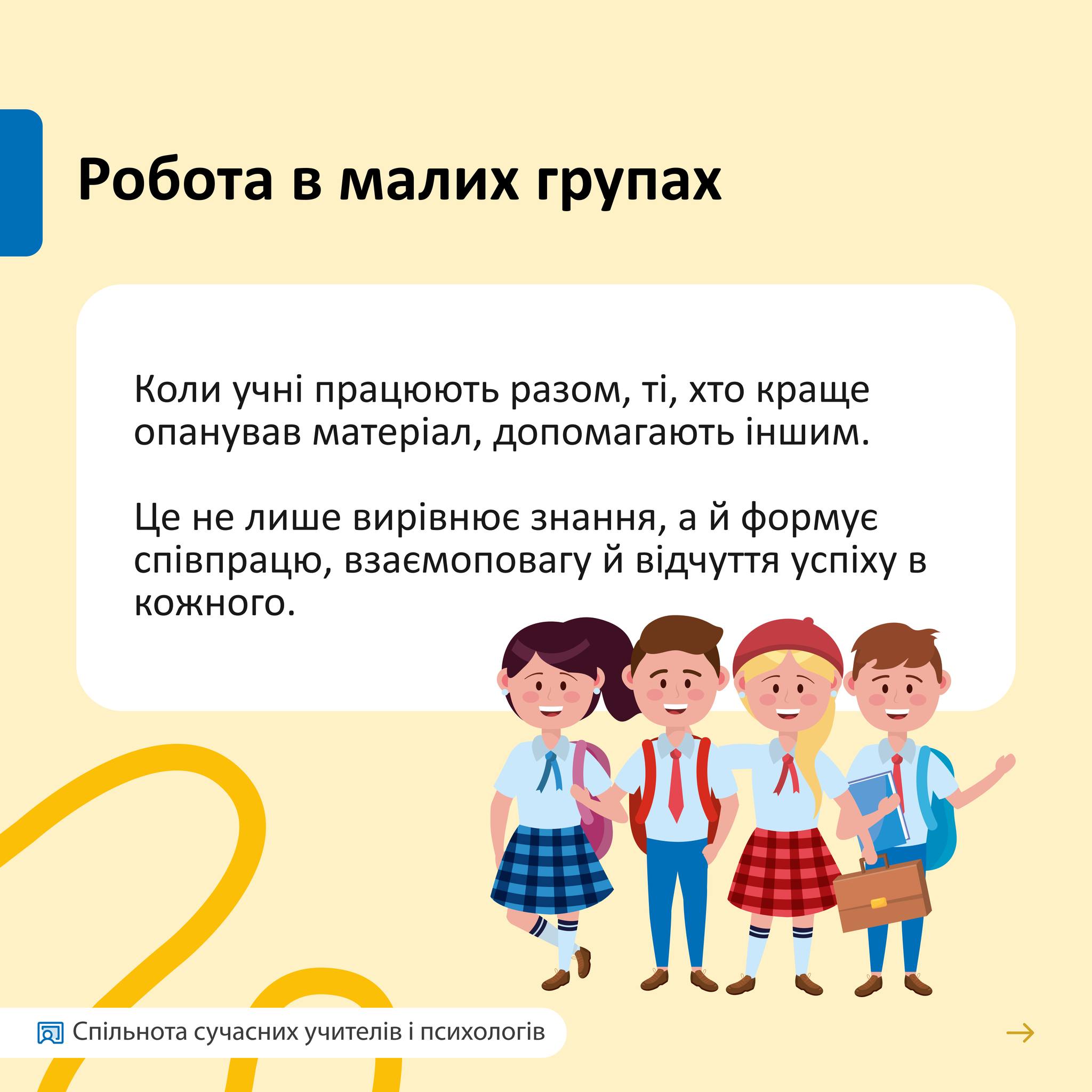 Сильніші учні повторюють матеріал, пояснюючи його іншим, а ті, кому складніше, засвоюють через взаємодію.