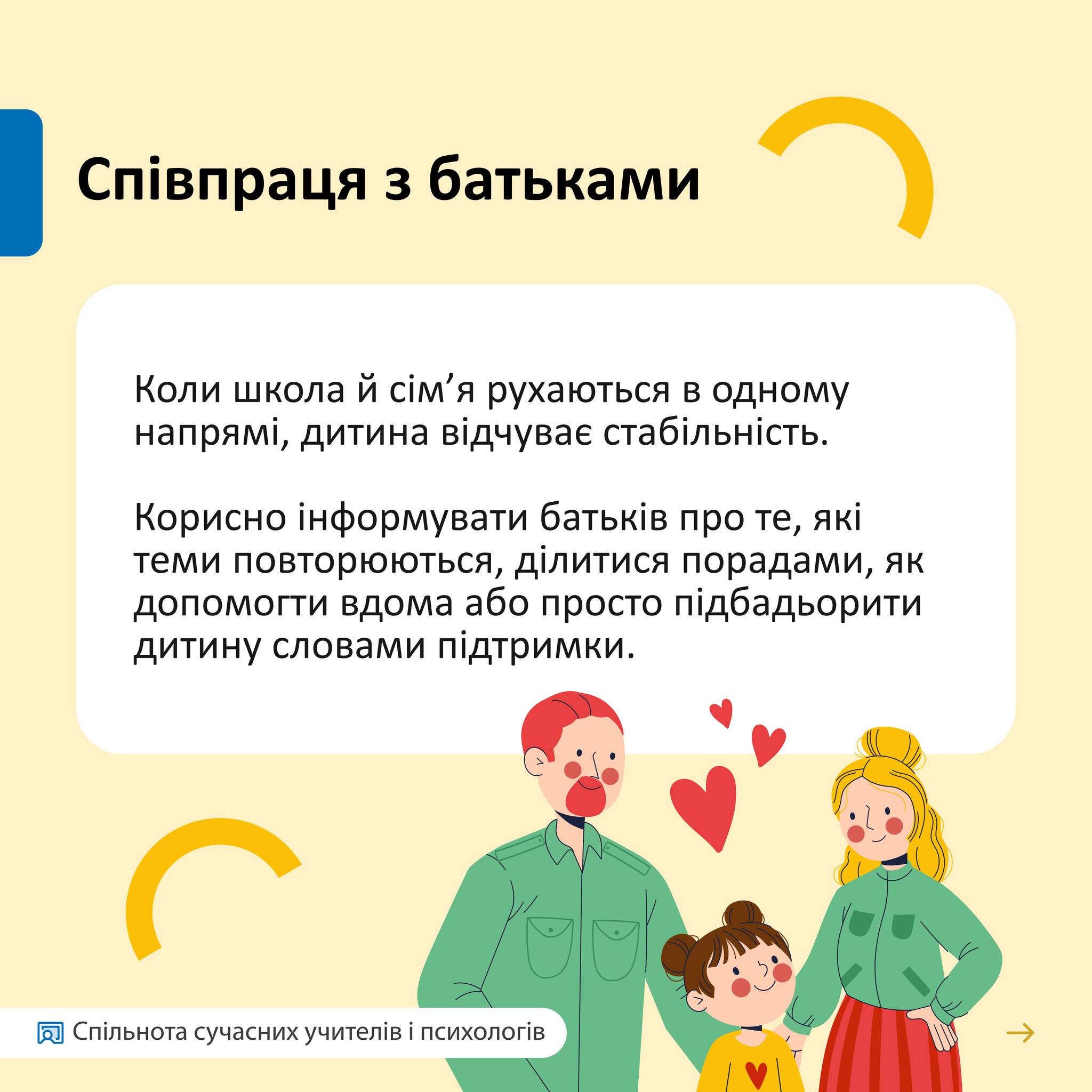 Коли школа й родина діють разом, дитина відчуває стабільність і підтримку. Батьки не завжди знають, як допомогти, тому варто ділитися простими інструментами.