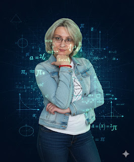 Згенеруй зображення цієї жінки, збережи обличчя, зміни одяг на молодіжний, та зроби фон математичний