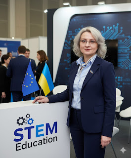 9. "Збережи обличчя. Створи професійне фото в стилі міжнародної конференції — я біля стенду з логотипом 'STEM Education', на фоні прапорів ЄС та України, офіційний одяг."