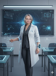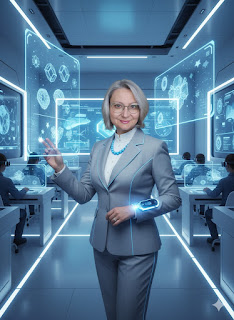 10. "Збережи обличчя. Зроби художнє фото у стилі 'викладач майбутнього' — я у футуристичному класі з голограмами, фон — освітній простір майбутнього, освітлення — холодно-блакитне."