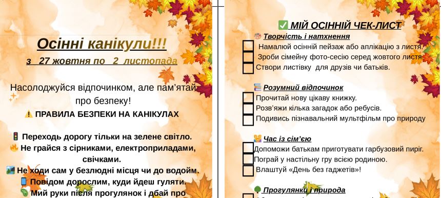 ✔ Правила безпеки на осінні канікули +цікавий чек-лист (завантажити)