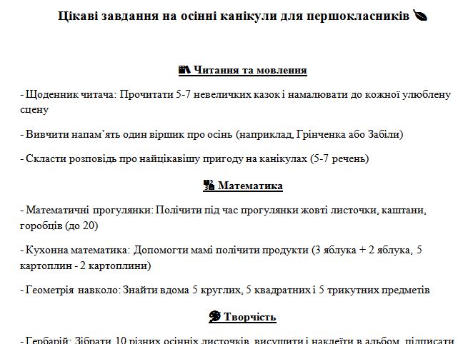✔ Цікаві завдання на осінні канікули для першокласників (завантажити)