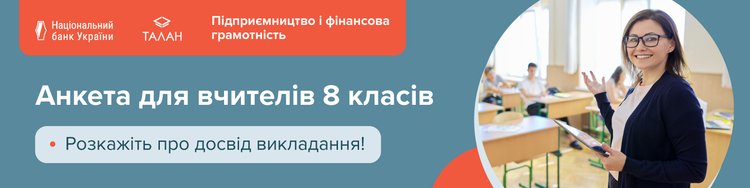 Центр фінансових знань “Талан” запрошує педагогів, які у 8 класах викладають предмет “Підприємництво і фінансова грамотність”, пройти опитування та поділитися своїми враженнями і досвідом.