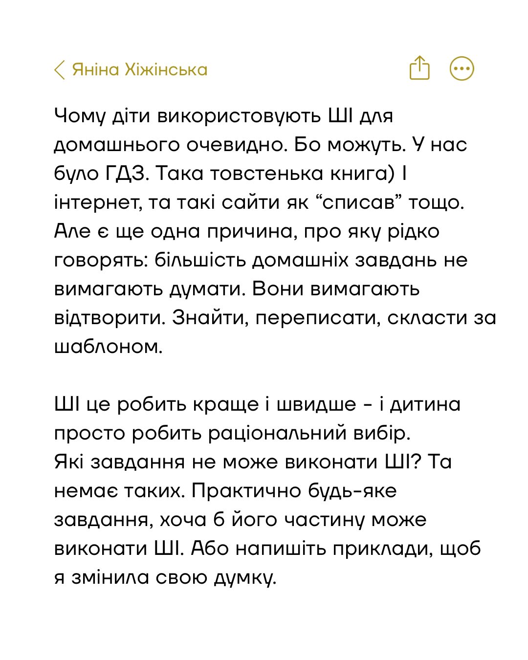 Історія: вчителька перевіряє домашні роботи восьмого класу. Сідає ввечері, відкриває зошити, читає есе і бачить, що три роботи написані майже однаково. Не скопійовані одна в одної, але однакові за структурою, за формулюваннями і за прикладами. ШІ. Очевидно.