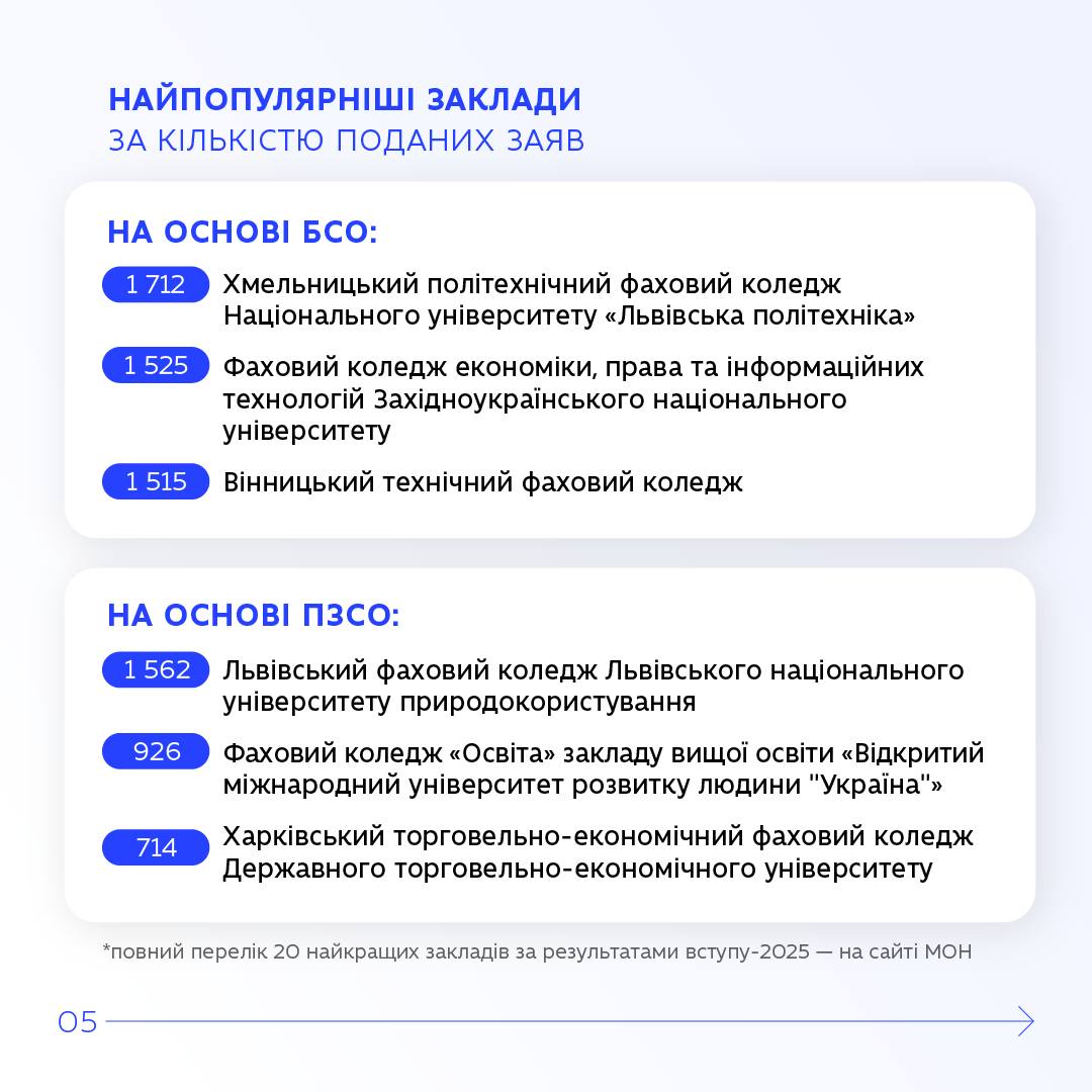 Підсумки вступної кампанії-2025 до закладів фахової передвищої освіти
