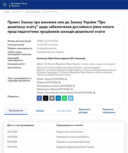 📄 Зазначений документ подано як альтернативу законопроєкту № 14358, який раніше передбачав суттєве підвищення мінімальних заробітних плат для працівників закладів дошкільної освіти шляхом їх прирівняння до рівня мінімальної заробітної плати педагогічних і науково-педагогічних працівників закладів загальної середньої, професійної, фахової передвищої та вищої освіти.