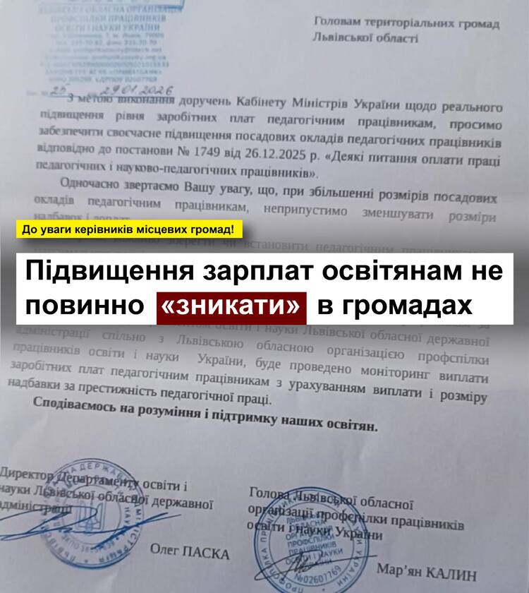 Рішення про підвищення зарплат ухвалене на державному рівні — і воно має бути реально виконане на всіх рівнях. Саме тому всі представники влади — від Уряду до громад на місцях — мають зайняти єдину позицію: зарплати освітян повинні зрости, а не «перерозподілитися на папері».