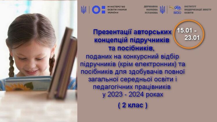 Шановні колеги! Цього тижня, з 15 до 23 січня 2024 року, відбудуться онлайн-презентації авторських концепцій підручників та посібників, поданих на конкурсний відбір підручників (крім електронних) та посібників для здобувачів повної загальної середньої освіти і педагогічних працівників у 2023-2024 роках (2 клас).