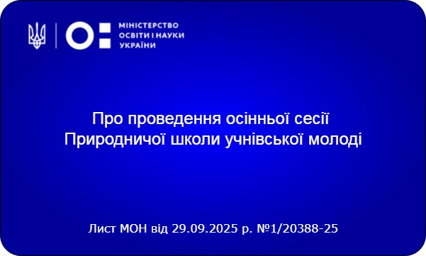 На виконання Плану всеукраїнських і міжнародних організаційномасових заходів з дітьми та учнівською молоддю на 2025 рік, затвердженого наказом Міністерства освіти і науки України від 21.11.2024 р. № 1641 (зі змінами), з 27 до З0 жовтня 2025 року Національний еколого-натуралістичний центр учнівської молоді спільно з Київським національним університетом імені Тараса Шевченка проведе осінню сесію Природничої школи учнівської молоді (далі - Школа).