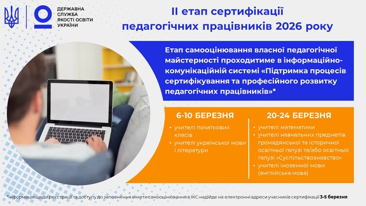Інформація щодо реєстрації та доступу до заповнення анкети самооцінювання в (ІКС) надійде на адреси електронної пошти учасників сертифікації 3-5 березня.