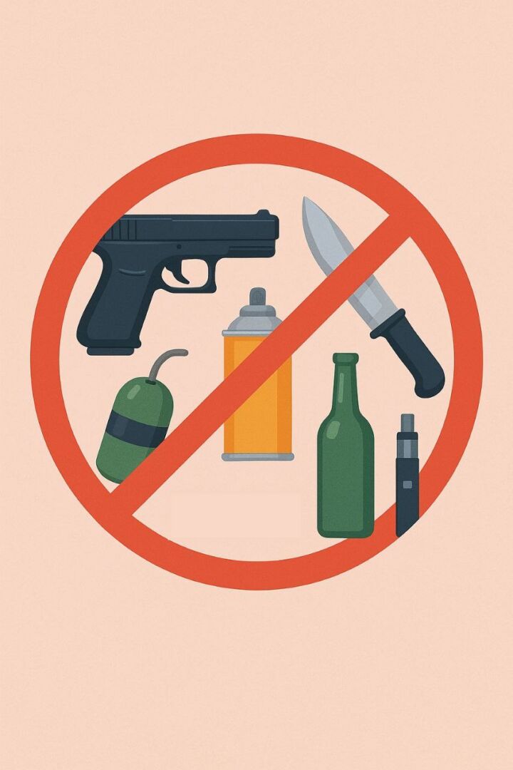 До переліку входять, зокрема, вогнепальна, пневматична та холодна зброя (ножі, луки, арбалети, кастети, нунчаки тощо) і її імітації (макети, муляжі, пристрої та іграшки), боєприпаси, вибухові та піротехнічні предмети, пристрої для відстрілу гумових куль, газові балончики, електрошокери, спецзасоби (кайданки, гумові та пластикові кийки), інструменти (молотки, викрутки, дрилі, пили, газові пальники), легкозаймисті речовини, наркотичні та психотропні речовини, алкоголь, тютюнові й електронні сигарети, пристрої для споживання тютюнових виробів без їхнього згоряння, а також енергетичні напої.
