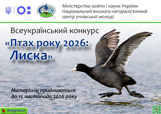 На виконання Плану всеукраїнських і міжнародних організаційномасових заходів з дітьми та учнівською молоддю на 2026 рік, затвердженого наказом Міністерства освіти і науки України від 19.11.2025 р. № 1523, та з метою привернення уваги учнівської молоді до проблем охорони птахів та їх природних біотопів, залучення учнів до активної природоохоронної роботи Національний еколого-натуралістичний центр учнівської молоді та Українське товариство охорони птахів запрошують взяти участь у щорічному конкурсі «Птах року 2026: Лиска Fulica atra» (далі – конкурс).